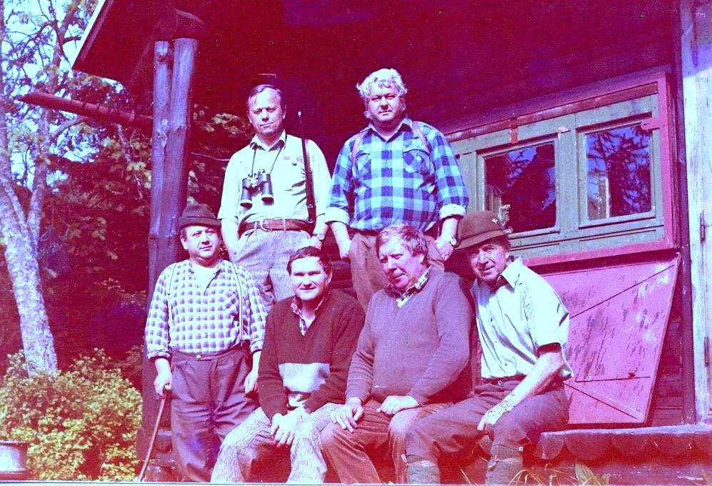 Partia poľovníkov na vybudovanej poľovníckej chate na
