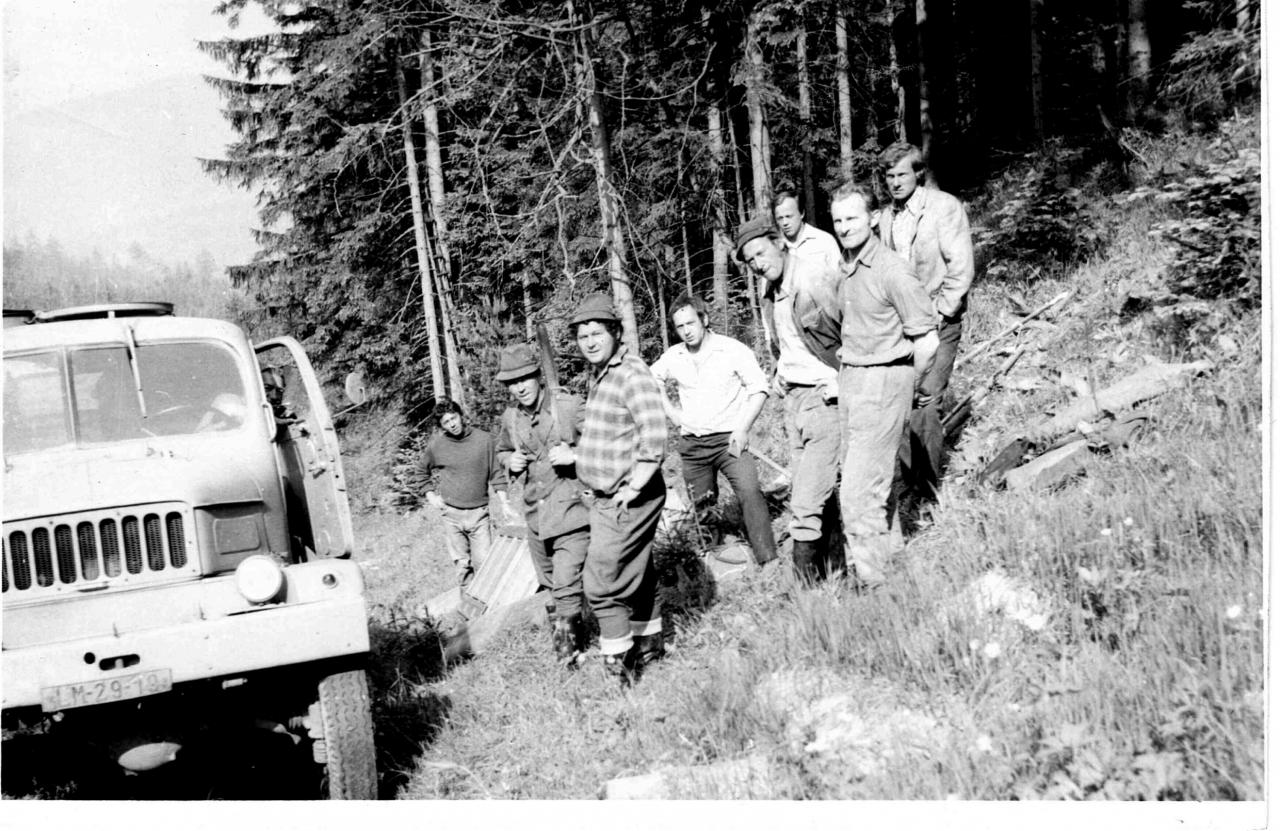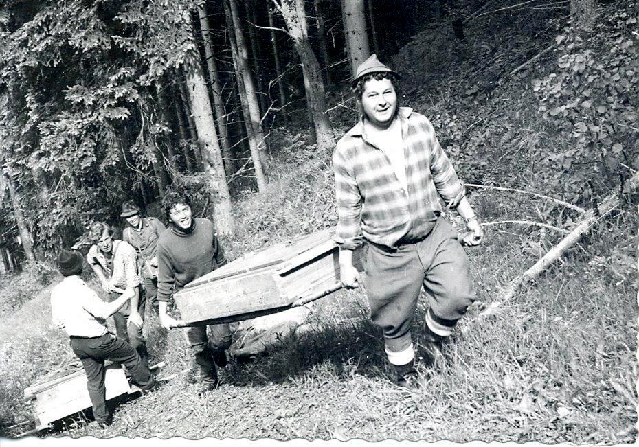 Poľanou v roku 1971. Na snímke pri vynášaní okeníc v Spušťáku je poľovník Eduard Stanický a pomocníci Jaroslav Mišala