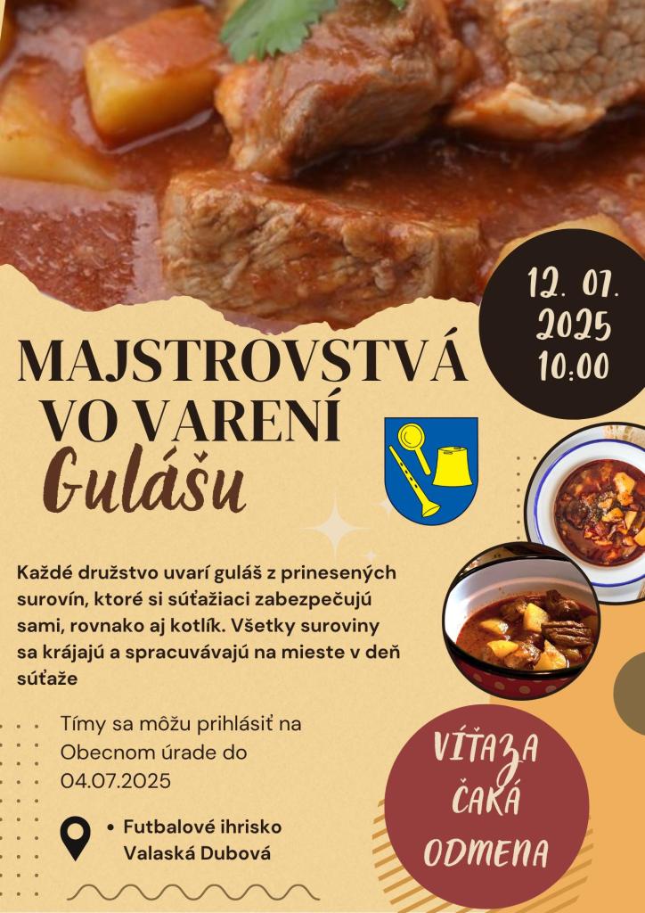 Po veľkom minuloročnom úspechu, pre Vás opäť pripravujeme Majstrovstvá vo varení gulášu, ktoré sa uskutočnia 12.07.2025 na futbalovom ihrisku vo Valaskej Dubovej. Kto ma chuť prísť ukázať svoje majstrovstvo vo varení gulášu alebo sa prísť len výborne zabaviť pri jeho varení sa môže prihlásiť na obec